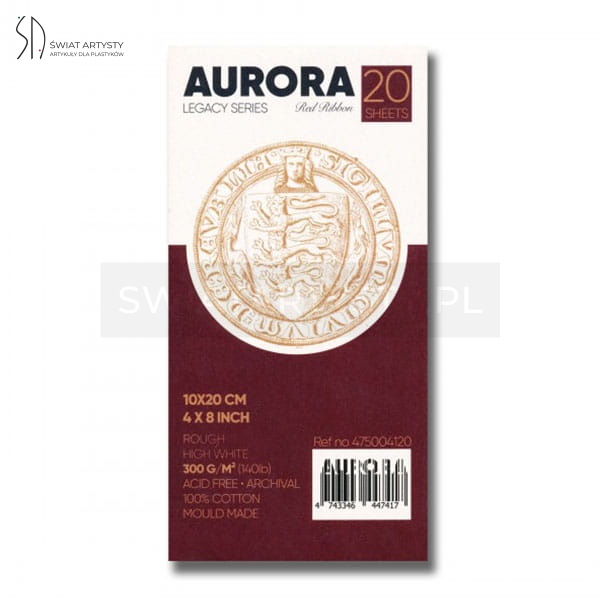 Marka AURORA powstała na początku 2019 roku w Tallinie, stolicy Estonii. W wyniku dynamicznego rozwoju zdobyła pozycję lidera na lokalnym rynku, oraz zdobyła grono stałych klientów na rynkach zagranicznych. PapierArtystyczny.pl jest wyłącznym dystrybutorem marki AURORA na terenie Polski. Szczególnie polecana jest seria Królewska Pieczęć - to najwyższej jakości 100% bawełniany papier akwarelowy, gruboziarnisty rough o gramaturze 300g/m². Papier ten nadaje się również doskonale do pozostałych technik malarskich i rysunkowych takich jak: gwasze, akryl, ołówek, pastele, tusz, ołówek czy węgiel.