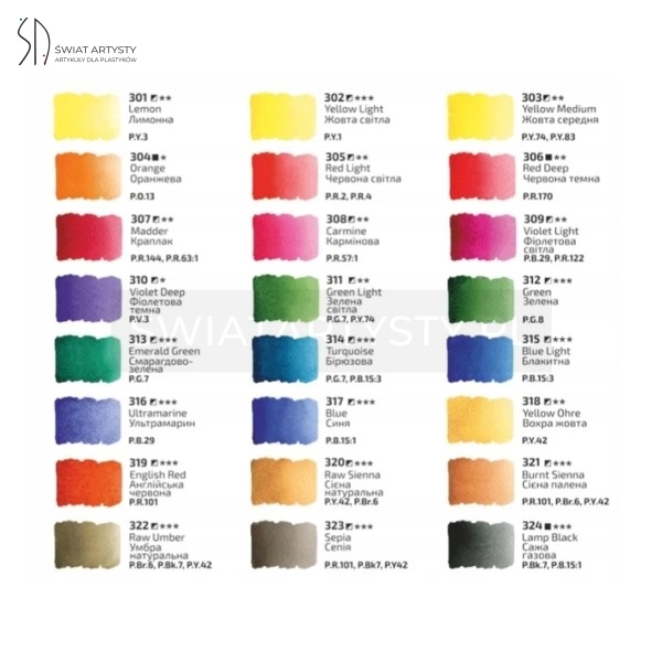 Akwarele zostały wykonane z naturalnych i syntetycznych pigmentów na bazie czystej gumy arabskiej. Wysoka jakość zastosowanych pigmentów gwarantuje czystość oraz transparentność kolorów, tak charakterystyczną dla techniki akwareli. Większość barw w gamie oparta jest na jednym pigmencie, co pozwala podczas mieszania uzyskiwać klarowne, świeże odcienie bez efektu „zgaszenia” koloru.