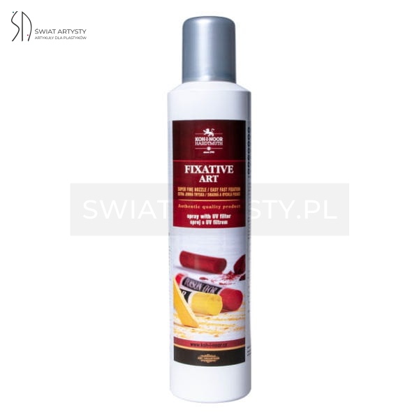 Fiksatywa ART Koh-i-noor w aerozolu do akryli, temper, węgla, ołówka i pasteli wyprodukowana jest na bazie bezbarwnych żywic syntetycznych i rozpuszczalników Chroni barwy i zapewnia trwałość pracy. Zwiększa połysk farb oraz sprawia, że prace wykonane farbami wodnymi, pastelami, ołówkiem lub węglem nie rozcierają się.