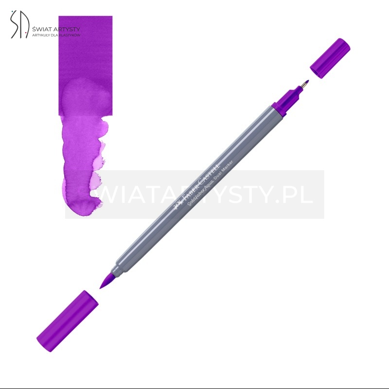 Dwustronny pisak akwarelowy Goldfaber Aqua Faber-Castell zachwyca niezwykłą intensywnością barw oraz szerokimi możliwościami pracy. Przy użyciu mokrego pędzla szkic lub motyw wykonany markerem można z łatwością zamienić w efektowny obraz o charakterze akwareli. Pozwala przy tym na znacznie większą precyzję niż tradycyjne farby akwarelowe.