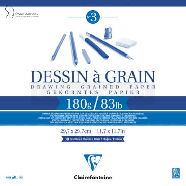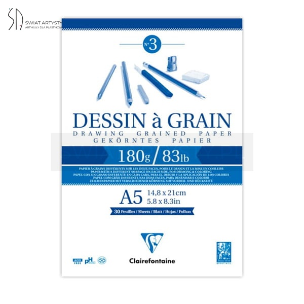 Blok rysunkowy Dessin a Grain firmy Clairefontaine posiada papier wykonany z czystej celulozy o lekko fakturowanej powierzchni, odpornej na mocny nacisk i wielokrotne wymazywanie. Poza tym jest to papier bezkwasowy, o naturalnym pH (nie zmienia kolorów farb i tuszy).