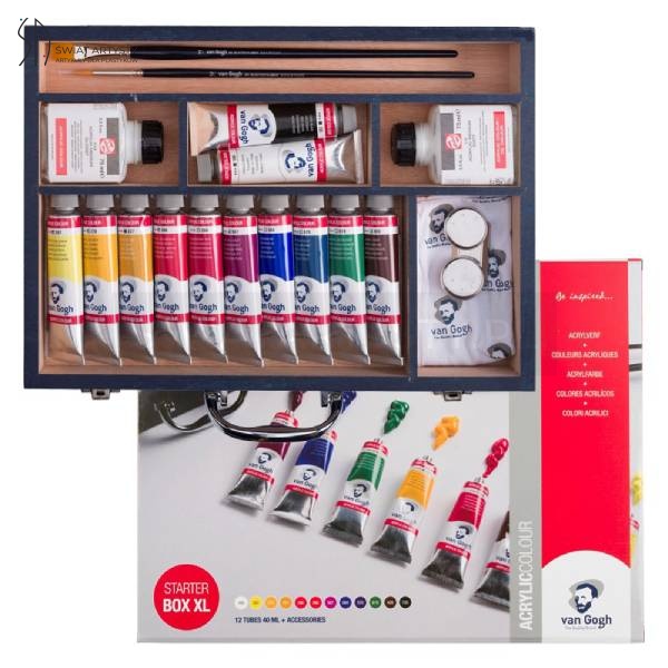 Zestaw Talens Starter Box XL Acrylic to dobrej jakości farby akrylowe serii Van Gogh, holenderskiej firmy Royal Talens. W zestawie producent zamieścił wszystkie niezbędne produkty do rozpoczęcia tworzenia w technice malarstwa akrylowego. Farby w podstawowej gamie kolorystycznej pozwoli tworzyć prace o różnej tematyce. Wyjątkowa pigmentacja i kremowa konsystencja wpływają na komfort oraz efekt końcowy namalowanej pracy.